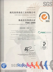 南充佳美于2018年取得了FSSC 22000食品安全體系認證證書(shū)。