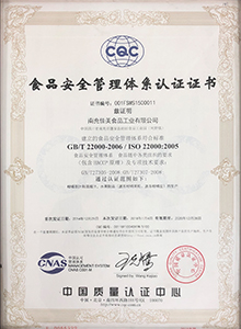 南充佳美于2014年按ISO 22000標準建立食品安全管理體系,同時(shí)取得ISO 22000食品安全管理體系認證證書(shū)。