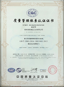 南充佳美于2008年按ISO 9000標準建立質(zhì)量管理體系,同時(shí)取得ISO 9001質(zhì)量體系認證證書(shū),并于2018年取得ISO 9001:2015質(zhì)量體系認證證書(shū)。